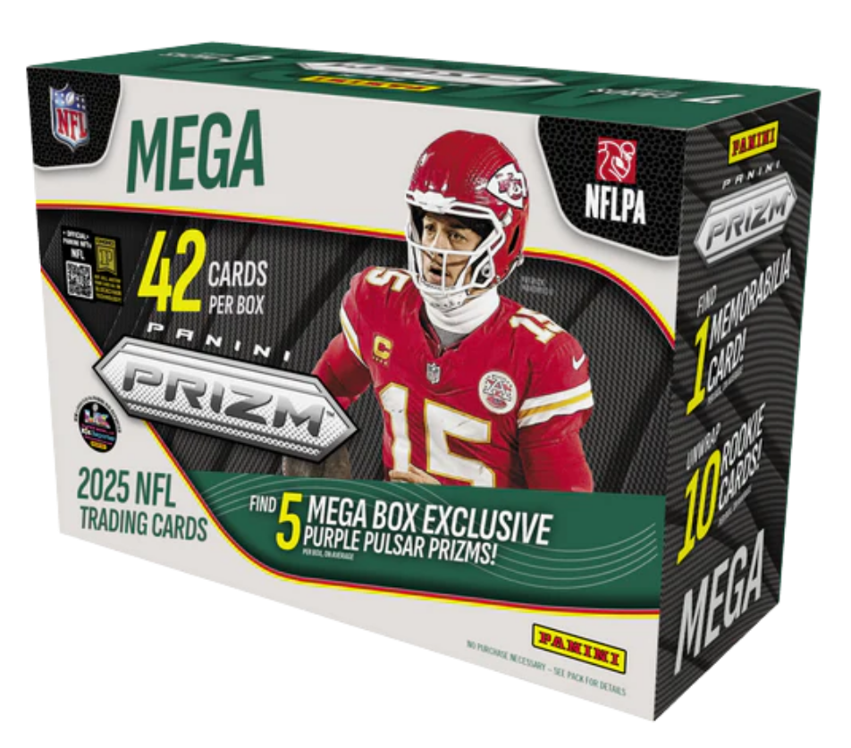 Prizm football in 2025 features a 300-card base set and a loaded Rookie lineup in Hobby Mega-exclusive Purple Pulsar parallels!