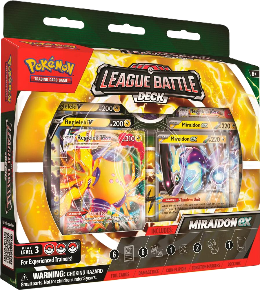 Get Charged Up with Miraidon ex & Regieleki VMAX! In each box, you’ll find: 1 ready-to-play 60-card deck 6 damage-counter dice 1 coin-flip die 2 coin condition markers 1 deck box 1 accessory box 1 …