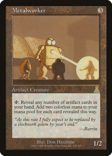T: Reveal any number of artifact cards in your hand. Add two colorless mana to your mana pool for each card revealed this way. Rarity:R #:135 Card Type:Artifact Creature P / T:1 / 2 Flavor:”At this…