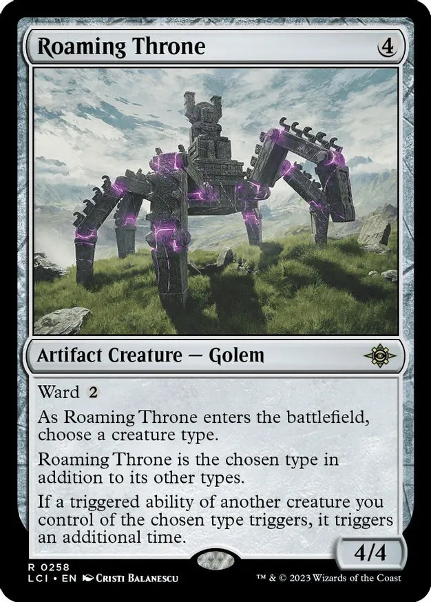 Product Details: Ward 2As Roaming Throne enters the battlefield, choose a creature type.Roaming Throne is the chosen type in addition to its other types.If a triggered ability of another creature y…